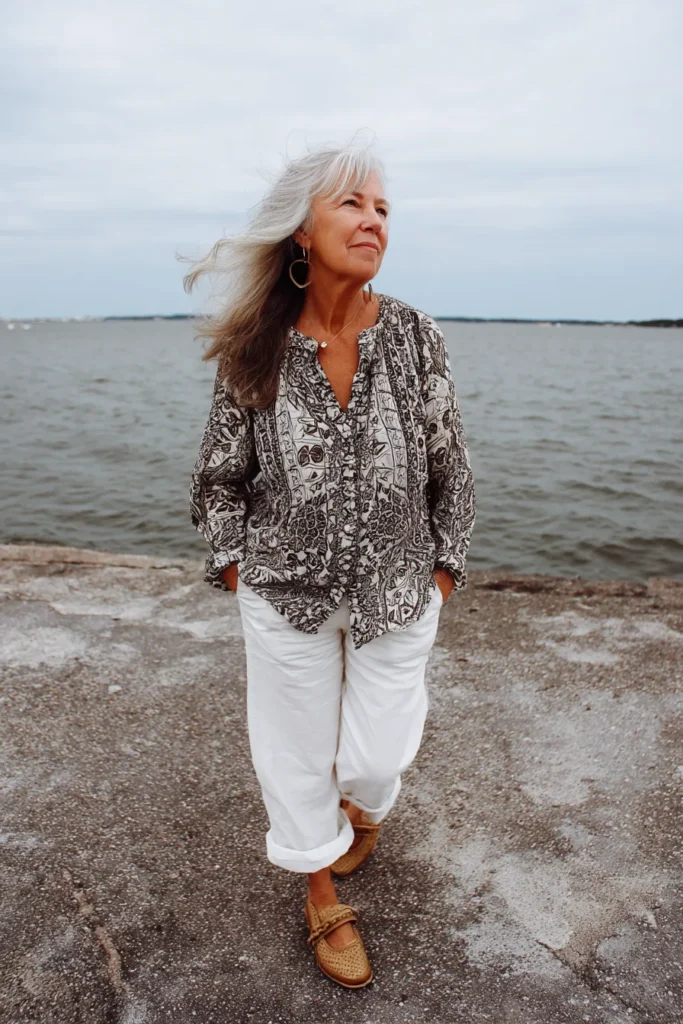 This outfit captures the essence of laid-back coastal boho style. The woman is wearing a patterned blouse with a soft, earthy print that feels both artistic and timeless. It’s paired with loose white trousers rolled at the hem and woven loafers in a warm tan tone, creating a breezy yet polished silhouette. The subtle jewelry and the ocean breeze complete the look, giving it that effortlessly natural vibe that never feels forced.