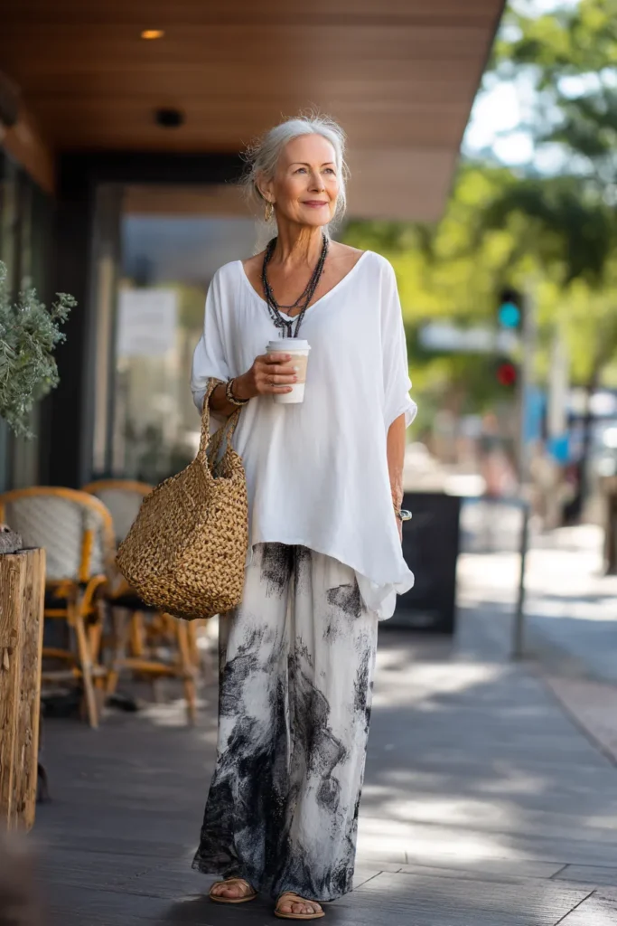 This outfit is pure easygoing elegance. The woman is wearing a loose white tunic top that flows beautifully with every step, paired with wide-leg pants featuring a black and gray artistic print. The light, airy fabrics make the whole look feel perfect for a warm afternoon stroll. Her accessories—a layered necklace, woven tote bag, and simple sandals—add just the right touch of relaxed boho flair without overcomplicating the look.