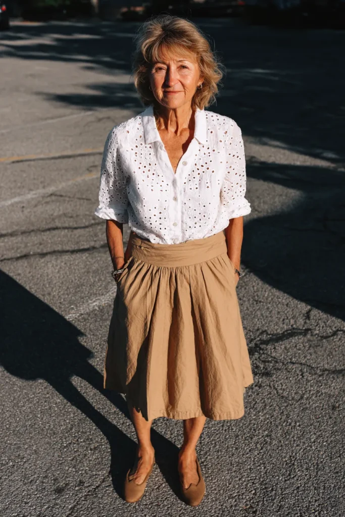 This outfit shows how simplicity can still feel beautifully bohemian. She’s wearing a crisp white eyelet blouse with rolled sleeves, paired with a flowy beige midi skirt that cinches softly at the waist. The natural cotton textures and earthy tones give the look a relaxed, sun-kissed feel, while the lightweight fabrics keep it airy and comfortable. It’s the kind of outfit that feels both polished and easygoing at the same time.