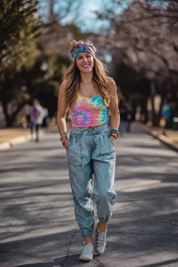 This outfit is pure, high-energy festival fun translated into a casual daytime date look perfect for exploring outdoors when the weather is warm and bright. She is rocking a vibrant tie-dye crop tank top that features all the fun colors like pink, blue, and yellow, tied up casually at the front. This is paired with relaxed, acid-wash or light-wash jogger-style jeans that are cinched at the ankle for a cool, roomy fit. The look is accessorized perfectly with a colorful patterned bandana tied around her hair and simple white sneakers.