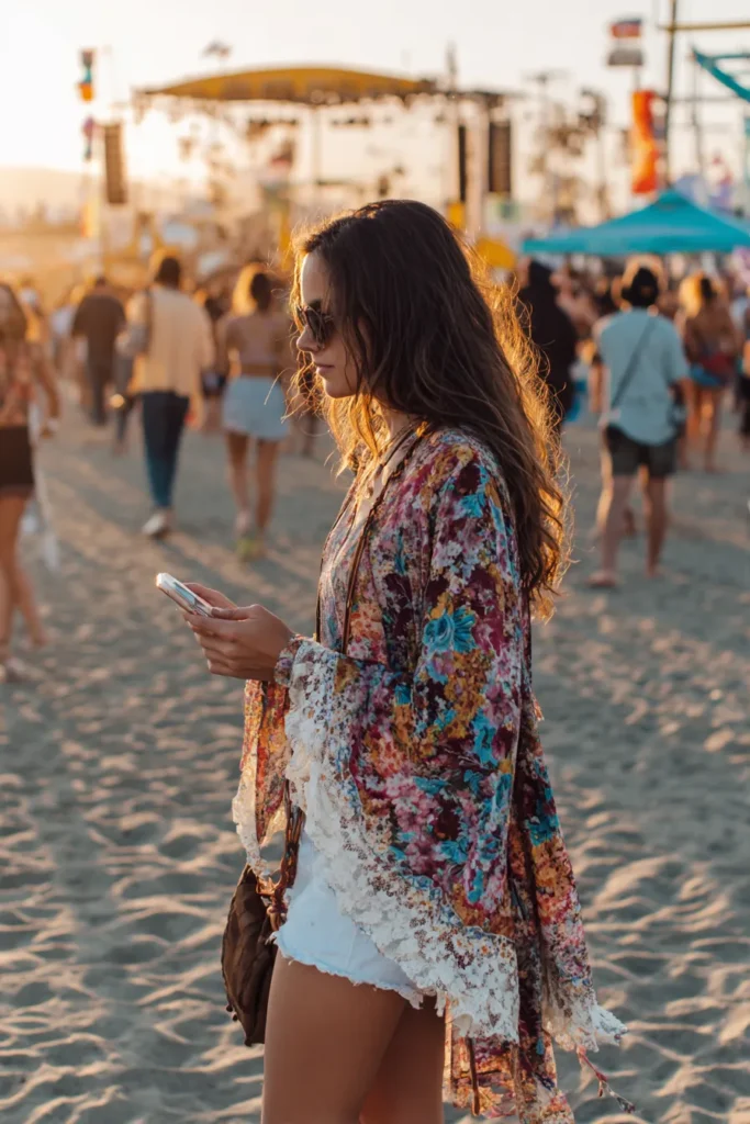 I love how this ensemble perfectly captures that carefree, easygoing Spring Break spirit. The kimono is the definition of boho layering, providing color and flow while keeping you cool enough for the warm weather. Wearing it over simple white shorts is genius because it lets that gorgeous, busy print really shine through. I feel like this is the ideal outfit for walking around a lively outdoor event because it’s comfortable for walking in the sand but still looks effortlessly glamorous when the light hits just right.