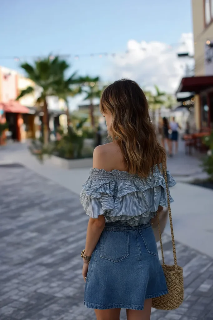This is the quintessential cute and playful ensemble for a warm Spring Break date exploring outdoor shops or a seaside town. She is wearing a flirty, light-wash denim mini skirt paired with a very feminine off-the-shoulder crop top featuring a delicate blue and white pinstripe. The top has gorgeous horizontal ruffles across the bust and sleeves, giving it that breezy, bohemian volume. Accessories are perfectly summery with a textured straw crossbody bag, layered gold jewelry, and a casual updo.