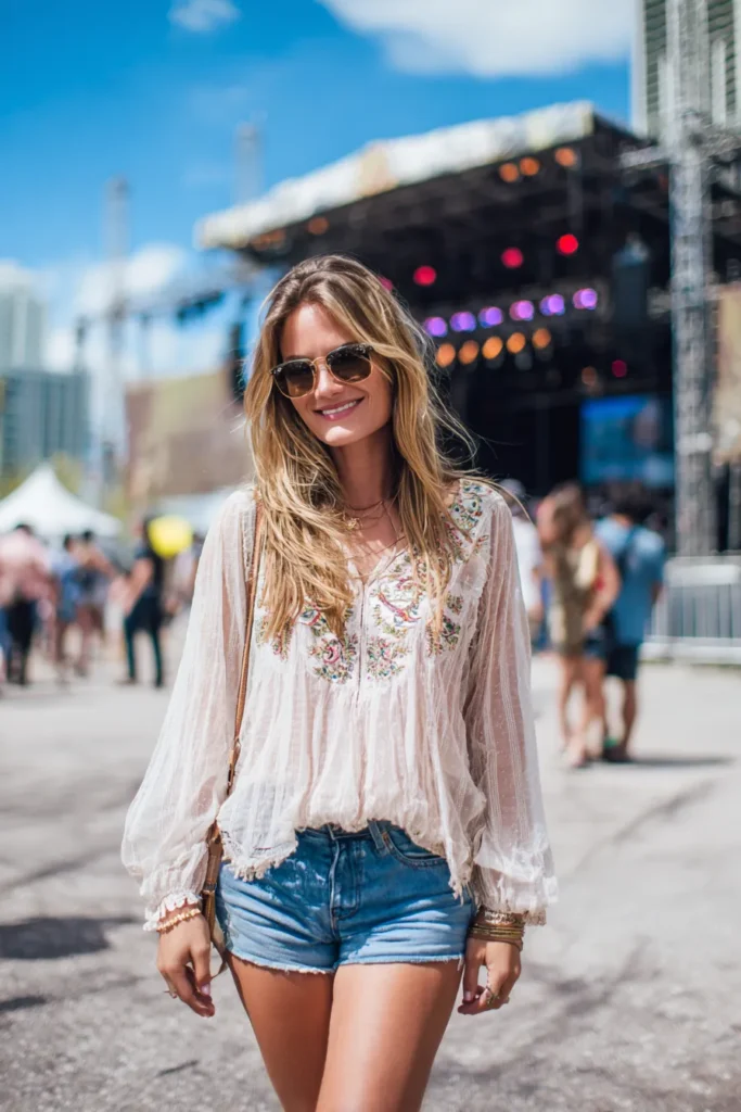 Embroidered Blouse and Denim Cutoffs Festival Look