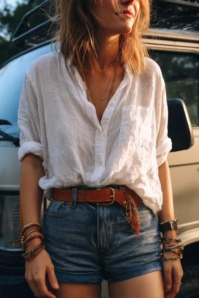 I feel like this is the easiest, most flattering way to wear denim shorts in a stylish way for a daytime date. That light, slightly crinkled white shirt feels so breezy and cool, perfect for warm weather, and unbuttoning it just so gives a relaxed vibe without showing too much. Tucking it slightly with a statement belt instantly gives structure to the loose top and draws attention to the waistline, which I love. All those layered accessories add that perfect touch of wanderlust and texture that makes the entire look feel authentically boho and ready for anything.