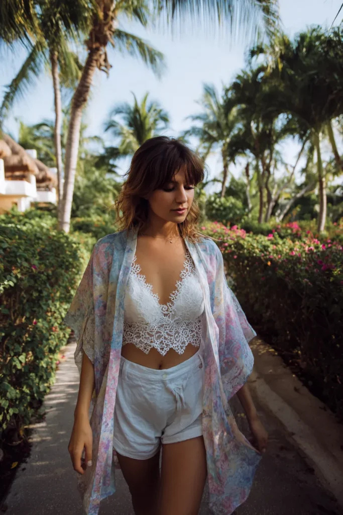I think this outfit is simply divine for vacation dates because it’s breezy, feminine, and showcases that gorgeous tan you’ve been working on. The combination of the intricate white lace bralette with the soft pastel kimono is peak boho romance without feeling heavy or overdressed for the heat. The loose shorts keep everything incredibly comfortable for walking around resort grounds or heading to a casual seaside spot. I feel instantly glamorous and ready for sunshine when I wear light, floaty layers like this kimono over something delicate underneath.
