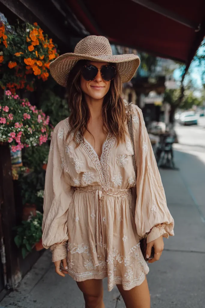 This look is the definition of effortless, sun-drenched boho charm, perfect for a warm Spring Break date while window shopping or exploring a cute outdoor market. She is wearing a short, flowy romper or mini dress in a delicate, slightly wrinkled blush or nude fabric that features exquisite white embroidery scattered across the bodice and skirt. The top has billowy long sleeves gathered at the wrist, and the waist is cinched with a simple drawstring tie to create shape. A wide-brimmed woven straw sun hat and layered gold necklaces complete this picture-perfect sunny day ensemble.