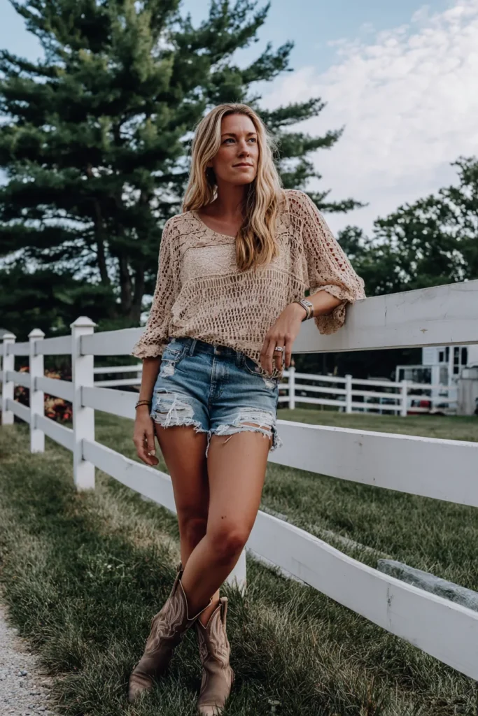 Get ready for some serious rustic chic with this look that just screams warm weather fun and maybe a little country fair magic. The star here is this amazing slouchy, loose-knit top, probably cotton or a similar breathable blend, in a beautiful natural beige or tan color with intricate crochet detailing that lets the sunshine peek through. It has those relaxed, bell-like sleeves which are so flattering. Down below we have super distressed, light-wash denim cutoffs, perfectly frayed and ready for action. The outfit is grounded by a pair of classic, detailed cowboy boots in a muted brown tone.