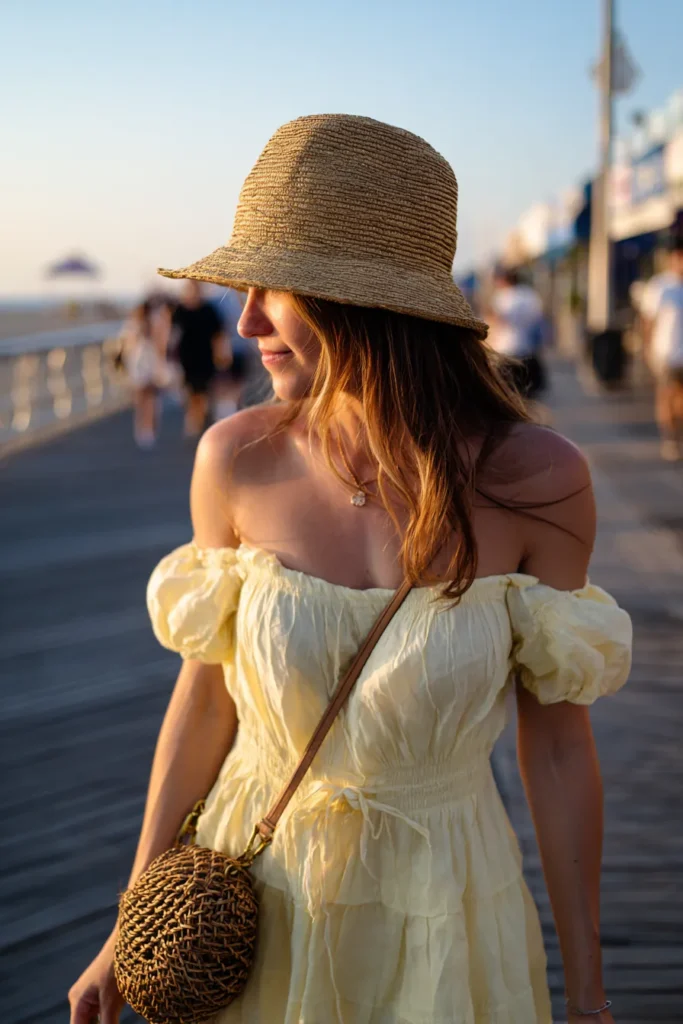 Honestly, this look makes me want to book a flight immediately. I find it so flattering because the off-the-shoulder cut highlights the collarbones and shoulders beautifully, and that smocked waist keeps everything looking defined without feeling restrictive at all. The pale yellow color just glows under the late afternoon sun, making everyone look instantly radiant. Plus, the straw hat and woven bag are not just cute they are totally practical for a day out near the water. It’s the right amount of romantic, cute, and totally relaxed for that perfect breezy vacation feeling.