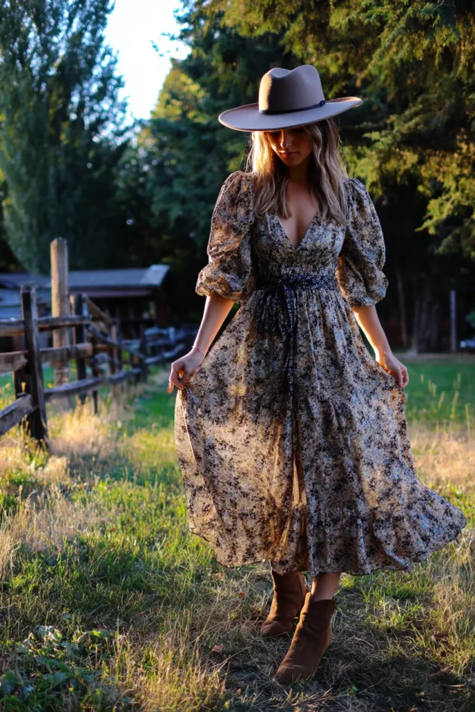 This look is pure boho romance with a hint of rustic charm. The woman is wearing a long flowy maxi dress in muted floral tones, featuring puff sleeves and a flattering cinched waist. The lightweight fabric catches the light beautifully, giving it that dreamy, effortless movement. Her wide-brimmed hat and suede ankle boots complete the outfit perfectly, creating a relaxed, countryside-meets-chic vibe.