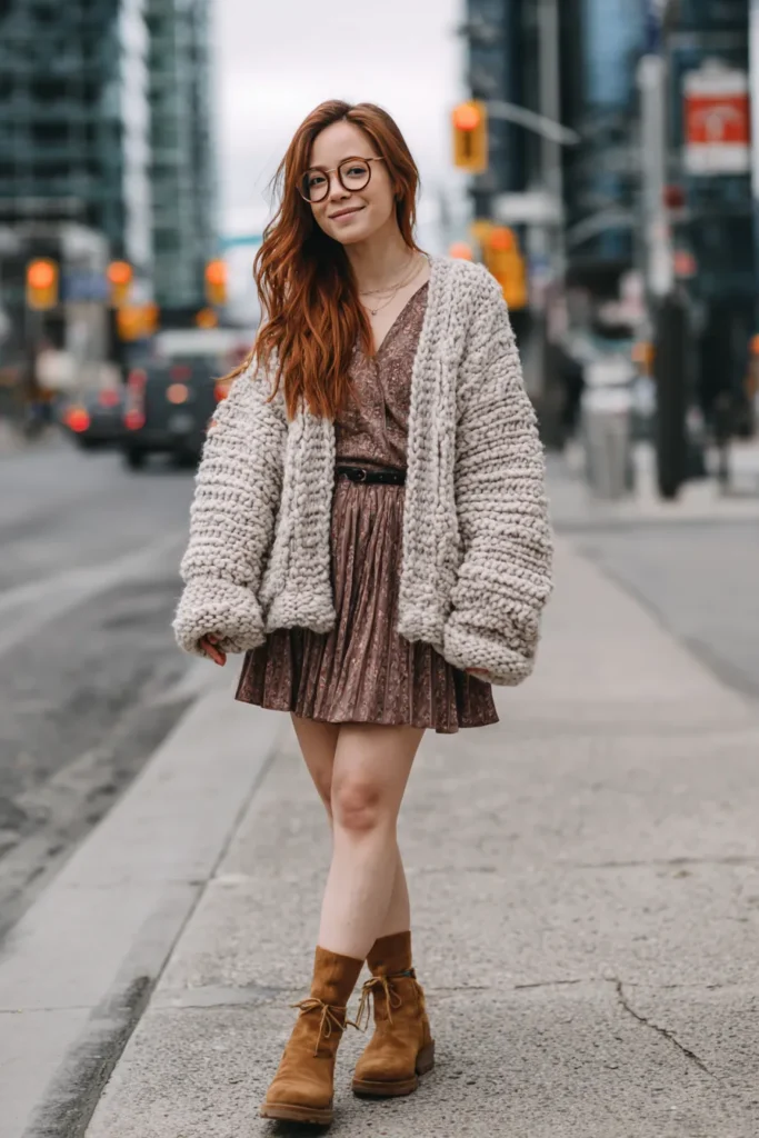 This outfit perfectly blends comfort and boho flair. The woman is wearing a soft, oversized chunky knit cardigan layered over a brown patterned mini dress with subtle pleats. The belted waist keeps the silhouette flattering, while the suede ankle boots add a grounded, earthy touch that fits the boho spirit. The warm, textured mix of fabrics gives the look a lived-in yet stylish vibe, perfect for a city stroll on a cool day.