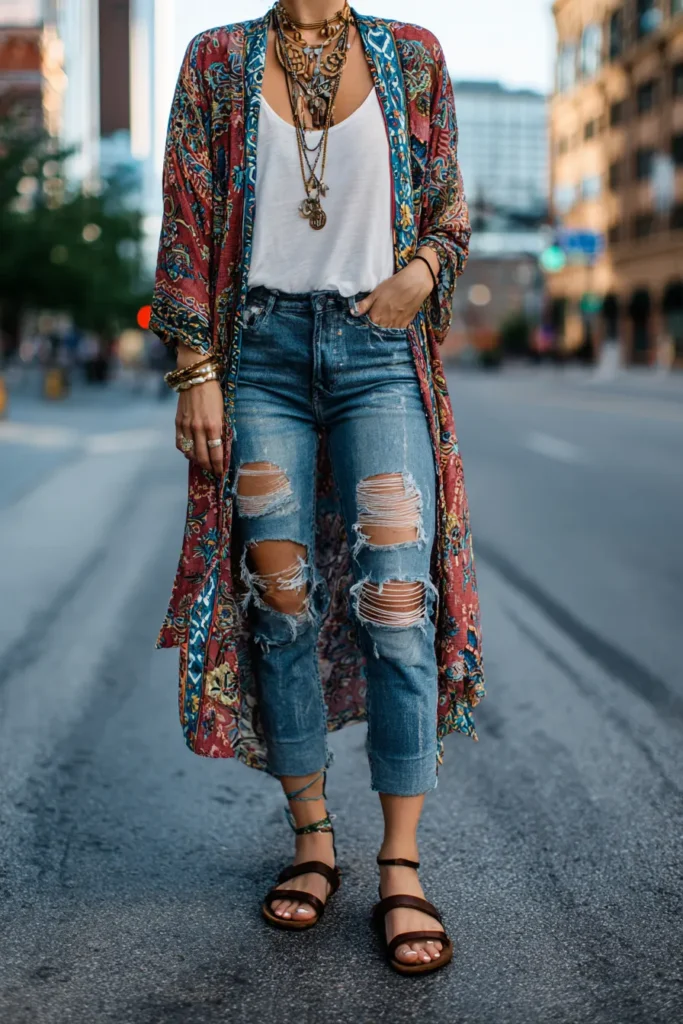 This outfit is pure boho energy. A long patterned kimono in rich reds and blues flows effortlessly over a simple white tank and distressed denim jeans. The layers of gold necklaces and chunky bangles add that free-spirited sparkle, while the strappy sandals keep everything grounded and relaxed. It’s colorful, carefree, and full of personality from head to toe.