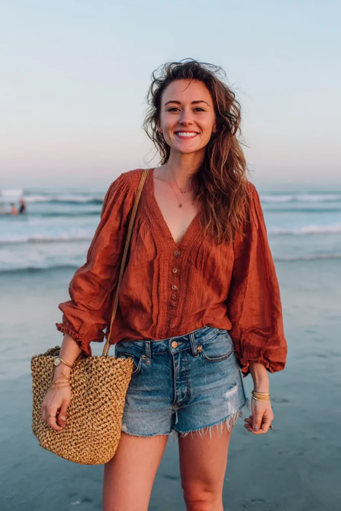 This outfit is the definition of laid-back boho charm. The woman is wearing a flowy rust-colored blouse with a deep V-neck and button detailing, perfectly tucked into high-waisted denim shorts with frayed hems. The woven straw tote adds an earthy touch, while minimal gold jewelry ties everything together. The ocean backdrop makes the whole look feel sun-kissed, relaxed, and free-spirited.