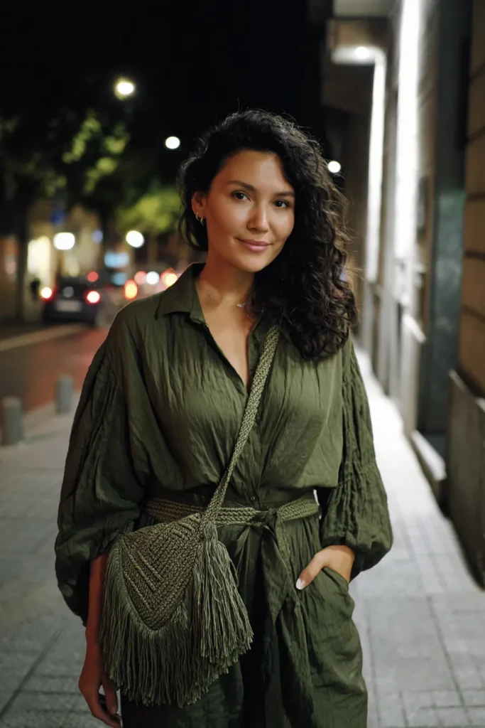 This look is all about understated boho elegance. The woman is wearing an olive green jumpsuit made from soft, crinkled fabric that drapes beautifully and adds natural texture. The wide sleeves and belted waist create a relaxed yet defined silhouette, while the matching woven fringe bag adds that perfect earthy detail. The muted color and monochrome styling make it feel effortlessly cool, even under the city lights.