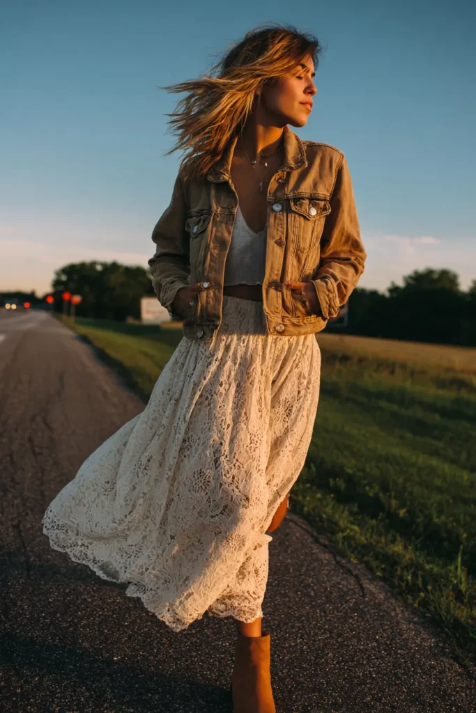 This outfit captures that perfect sunset kind of magic. The woman is wearing a flowy cream lace skirt that moves beautifully in the breeze, paired with a cropped white top and a light brown denim jacket. The textures mix so effortlessly, giving that easygoing boho vibe while still feeling polished. Her tan ankle boots finish the look with a touch of earthy charm that ties everything together.