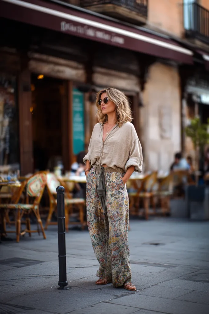 This outfit nails the art of looking effortlessly stylish. The woman is wearing flowy patterned pants with a relaxed fit, paired with a soft beige linen blouse that’s loosely tucked in. The muted tones and natural fabrics give it that breezy, boho sophistication, while her sandals and sunglasses keep the look grounded and easygoing. It’s comfortable, feminine, and quietly confident.