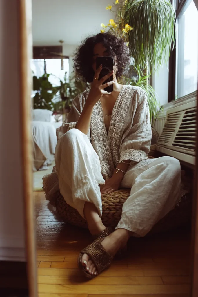 This outfit is the perfect mix of comfort and quiet elegance. The woman is wearing a light embroidered tunic in soft linen with intricate lace detailing, paired with loose cream-colored trousers that flow naturally. The woven slides and minimal jewelry keep everything earthy and grounded. The muted palette and soft fabrics make the whole look feel serene, like something you’d wear on a slow morning surrounded by plants and sunlight.