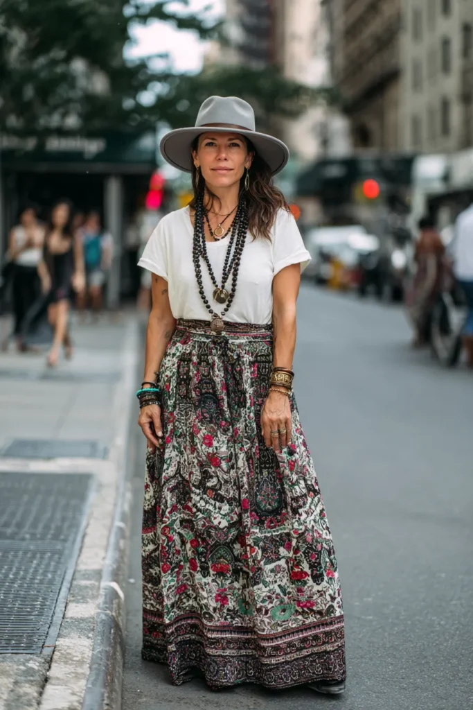 This outfit is boho street style at its best. The woman is wearing a white tee tucked into a long flowy maxi skirt with a colorful floral print. The mix of bold jewelry, stacked bangles, and beaded necklaces adds that signature free-spirited touch. The wide-brimmed gray hat ties it all together, giving the whole look a mix of artistic flair and easy confidence that feels perfectly at home on a busy city street.