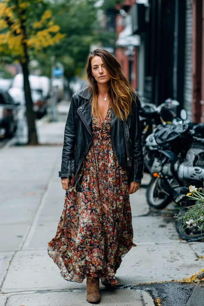 This outfit brings together the best of edgy and bohemian style. The woman is wearing a long floral maxi dress with warm tones of red, orange, and green, paired with a black leather jacket that gives the look instant attitude. Her brown ankle boots add a casual, lived-in touch, and the whole ensemble feels like the perfect mix of city cool and carefree spirit.
