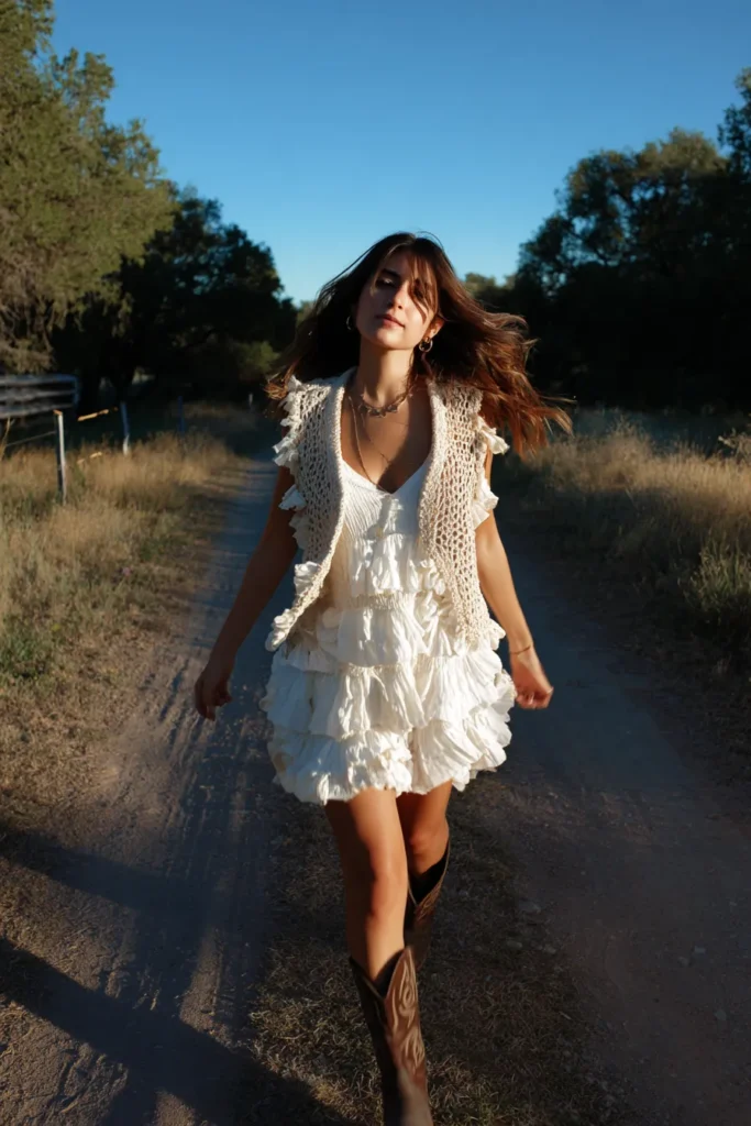 This outfit captures the carefree side of boho style perfectly. The woman is wearing a flouncy white mini dress with soft ruffled layers that move beautifully as she walks. Over it, she’s added a cream crochet vest that brings texture and a touch of handmade charm. The brown cowboy boots pull it all together, giving the look a rustic, playful edge that feels just right for golden-hour strolls on a dusty path.