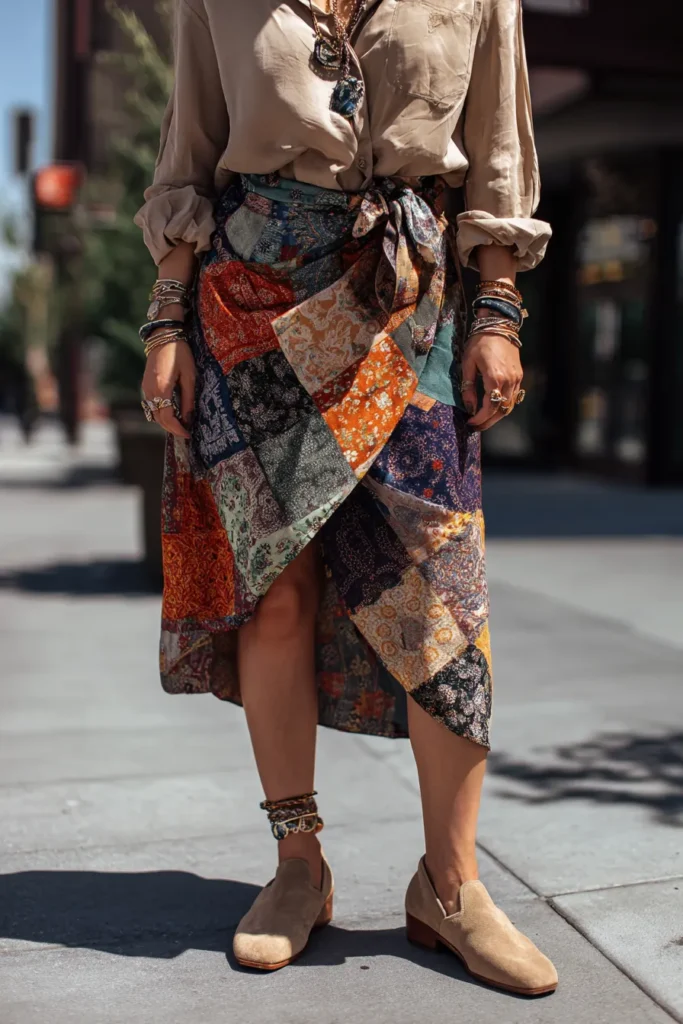 This outfit is the definition of boho creativity. The woman is wearing a colorful patchwork wrap skirt filled with rich tones of orange, teal, and burgundy, tied neatly at the waist for a flattering fit. She pairs it with a soft beige blouse, rolled-up sleeves, and layered jewelry—each bracelet and necklace adding its own story. The suede loafers and ankle charms bring a subtle rustic charm that keeps the look grounded and wearable.