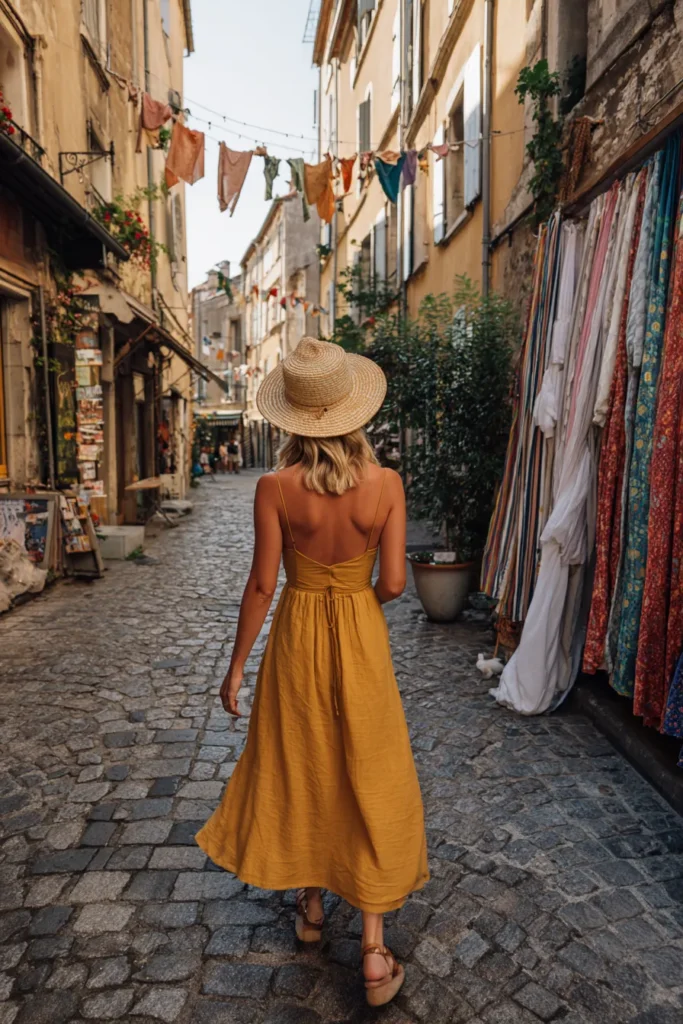 This outfit is pure sunshine in clothing form. The woman is wearing a mustard-yellow midi sundress with thin straps and a flowy silhouette that moves effortlessly with every step. The lightweight linen fabric gives it that soft, natural feel that’s perfect for warm days. A woven straw hat adds the ideal finishing touch, balancing style and practicality while giving the look that breezy boho vacation vibe.