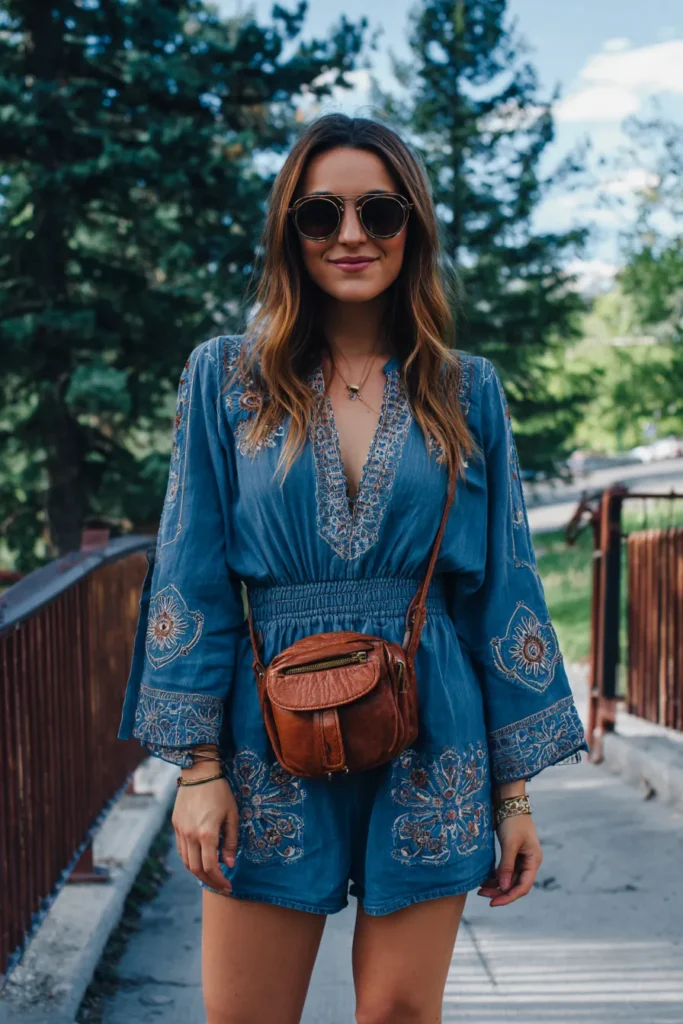 This outfit nails that effortless boho vibe in the best way. The woman is wearing a denim romper with beautiful embroidered detailing along the neckline and sleeves. The cinched waist gives it a flattering shape while keeping it comfy and relaxed. She pairs it with oversized round sunglasses and a small brown leather crossbody bag that adds a vintage touch. The look feels perfectly balanced between casual and chic.