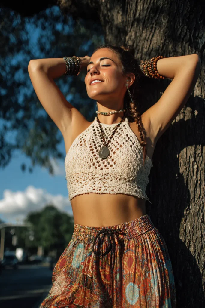This look captures the true spirit of boho freedom. The woman is wearing a cream crochet halter crop top paired with flowy patterned pants in warm earthy tones. The crochet adds a handmade, vintage touch, while the wide-leg pants bring comfort and movement. Layered necklaces, bracelets, and a few beaded details complete the look, creating that carefree, sun-soaked vibe that feels perfectly effortless.