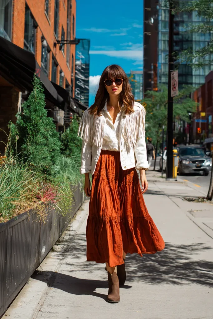 This look is a perfect mix of boho flair and urban confidence. The woman is wearing a white fringe jacket layered over a crisp button-up shirt, paired with a flowy rust-colored maxi skirt. The earthy tones and soft fabrics make the outfit feel warm and grounded, while the fringe detailing adds that playful western-inspired twist. Brown suede ankle boots complete the look with just the right touch of vintage charm.