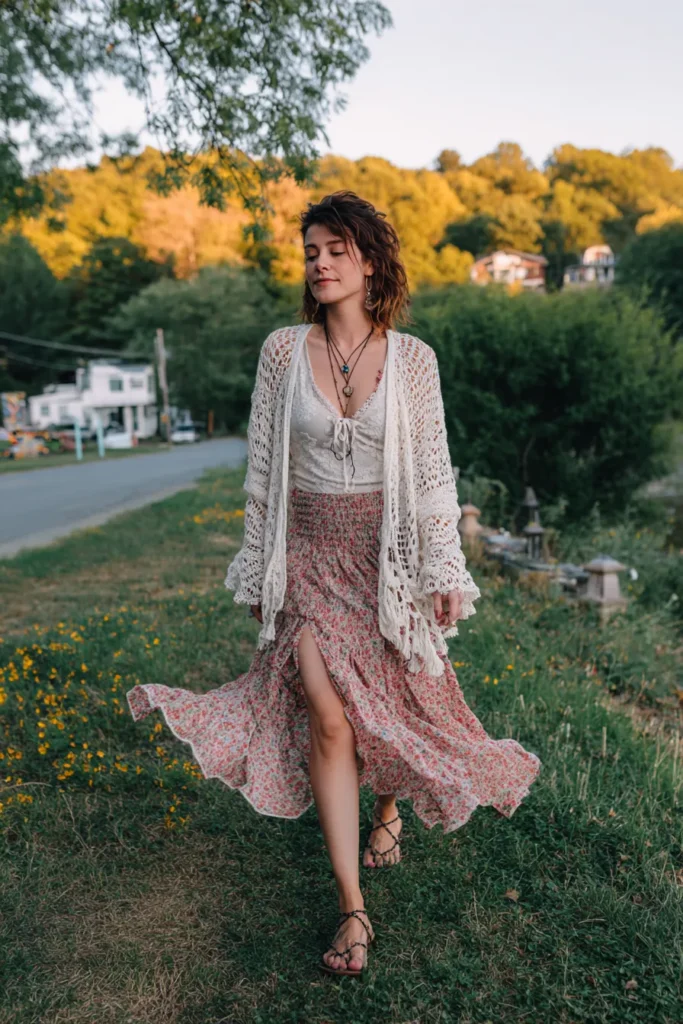 This outfit is the ultimate example of effortless boho charm. The woman is wearing a flowing floral maxi skirt with a front slit, paired with a soft lace-up top and an oversized crochet cardigan. The light fabrics move beautifully with the breeze, and the layered necklaces add that perfect touch of wanderlust energy. Strappy sandals complete the look, making it ideal for a barefoot-in-the-grass kind of day.