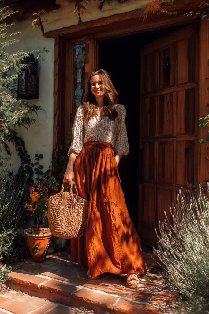 This look captures everything I love about relaxed boho fashion. The woman is wearing a lightweight printed blouse tucked into a rust-colored maxi skirt that flows beautifully with every step. The warm tones feel cozy and natural, and the woven straw tote adds the perfect casual touch. Flat sandals and soft sunlight complete the picture, giving the whole outfit that easy, Sunday-morning charm.