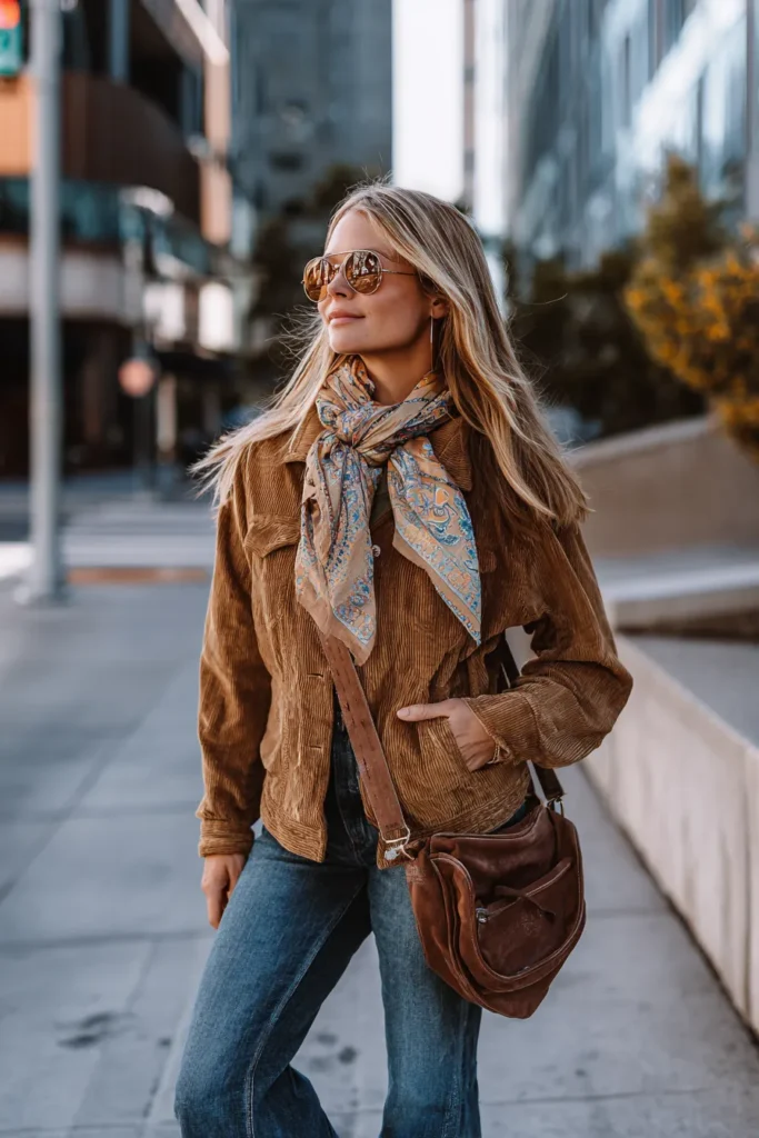 This outfit gives classic boho a city-girl upgrade. The woman is wearing a tan corduroy jacket paired with mid-wash flared jeans, a paisley scarf tied in a loose bow, and a slouchy brown leather crossbody bag. Her aviator sunglasses add the perfect vintage flair, making the look feel timeless and full of personality. It’s the kind of outfit that feels both relaxed and effortlessly stylish.