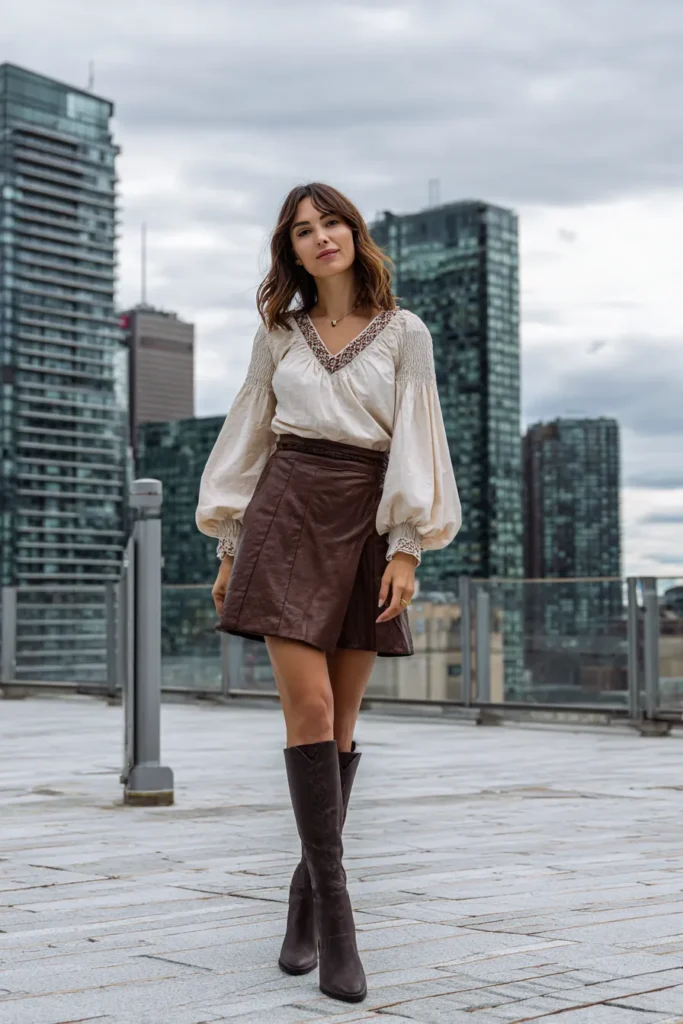 This outfit gives modern boho a polished twist. The woman is wearing a cream peasant-style blouse with delicate embroidery around the neckline and dramatic puff sleeves, paired with a brown leather mini skirt that adds just the right edge. Knee-high boots pull everything together, keeping the look sleek yet full of personality. The city backdrop adds a cool contrast to the free-spirited vibe of her outfit.
