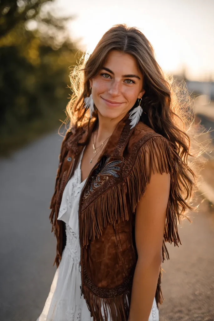 This outfit captures that perfect mix of wild and romantic. The woman is wearing a soft white lace dress that brings a touch of sweetness, layered under a brown suede vest covered in fringe and embroidered details. Her feather earrings and loose wavy hair complete the effortlessly free-spirited vibe, glowing beautifully under the golden sunset light.