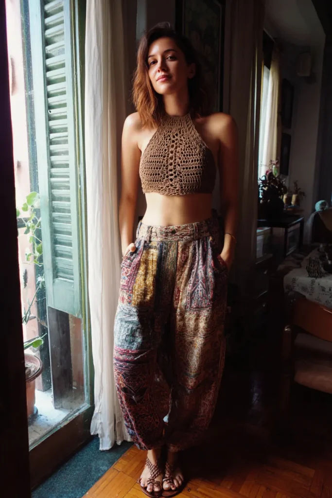 This look is the definition of laid-back boho charm. The woman is wearing a brown crochet halter top that feels both earthy and feminine, paired with loose, high-waisted harem pants covered in intricate multicolor patchwork patterns. The lightweight fabrics and relaxed fit make it perfect for warm afternoons or cozy indoor days. Barefoot or with strappy sandals, it gives off pure wanderlust energy.