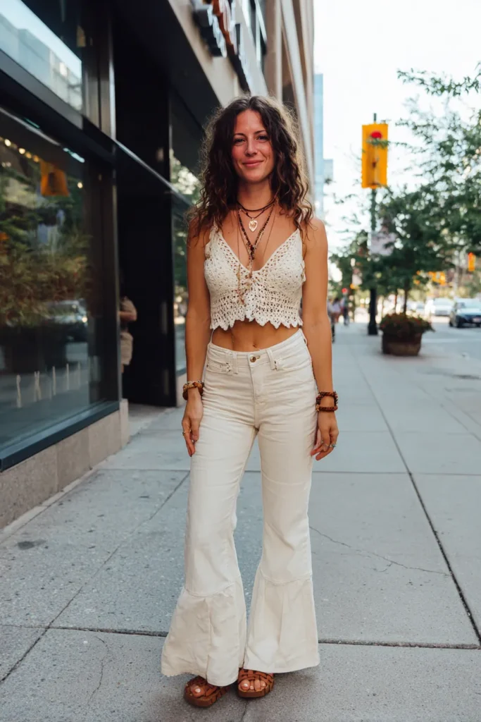 This look is a summer dream come true. The woman is rocking a white crochet crop top with delicate detailing, paired with high-waisted flared pants that add a touch of retro flair. Her platform sandals and layered necklaces complete the look, giving it that effortlessly free-spirited energy boho style is known for. The monochrome palette keeps it simple but never boring.