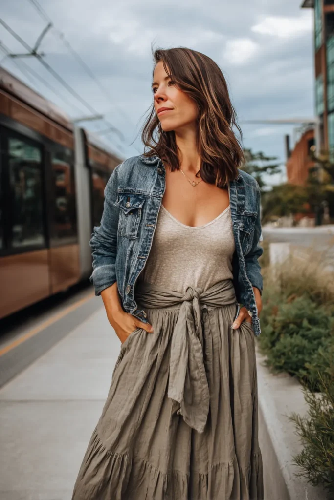 This outfit blends casual comfort with that easy boho polish we all love. The light denim jacket adds a structured touch to balance out the soft, flowy khaki maxi skirt tied neatly at the waist. Underneath, a simple beige tank keeps things light and neutral, while the relaxed fit and natural fabrics give the look that laid-back charm.