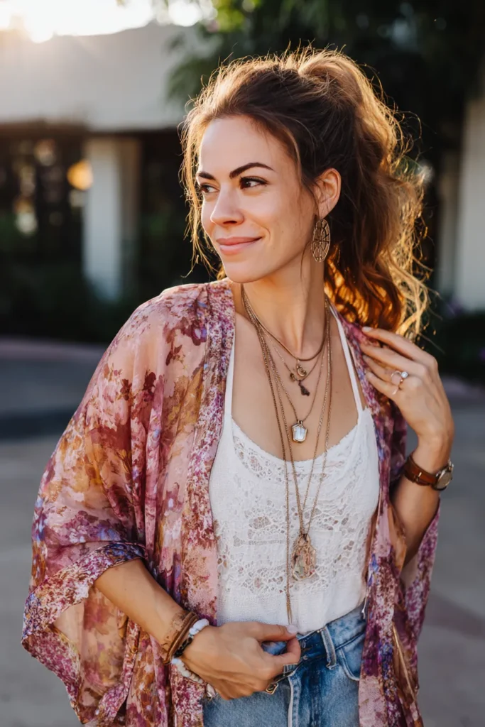 This outfit is the definition of carefree boho style with a touch of polish. The light lace camisole pairs beautifully with the flowy floral kimono in warm pink and amber tones, while layered gold necklaces and statement earrings bring in that effortlessly curated vibe. Paired with high-waisted jeans, it feels relaxed but still completely intentional.