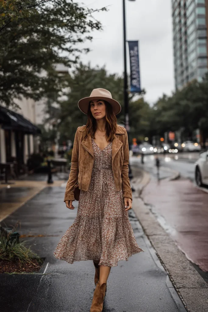 This outfit nails that effortless boho polish. The light brown suede jacket adds structure and warmth to the soft floral midi dress that moves beautifully with each step. The neutral tones of the outfit blend seamlessly with the felt wide-brim hat and tan ankle boots, creating a perfectly balanced mix of cozy and chic.