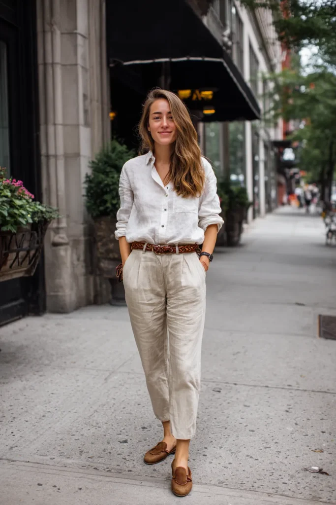 This outfit is a masterclass in effortless style. The crisp white linen button-up is loosely tucked into a pair of high-waisted beige linen trousers, cinched with a woven brown belt for that extra boho touch. Paired with tan loafers, rolled-up sleeves, and a relaxed silhouette, it’s simple, breathable, and impossibly chic.
