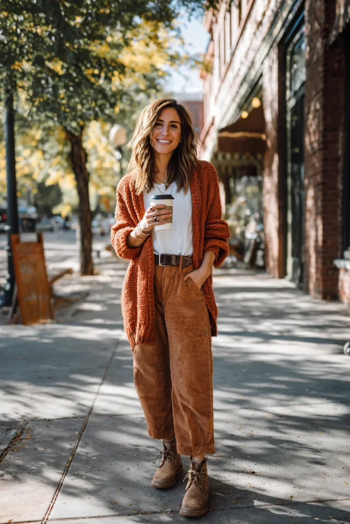 This outfit is pure fall comfort with a boho twist. The chunky rust-orange cardigan feels like a warm hug, layered over a soft white tee tucked into high-waisted tan corduroy pants. A dark brown belt ties it all together, while lace-up ankle boots give it that relaxed, ready-for-anything vibe. The earthy tones make it look naturally cohesive without trying too hard.