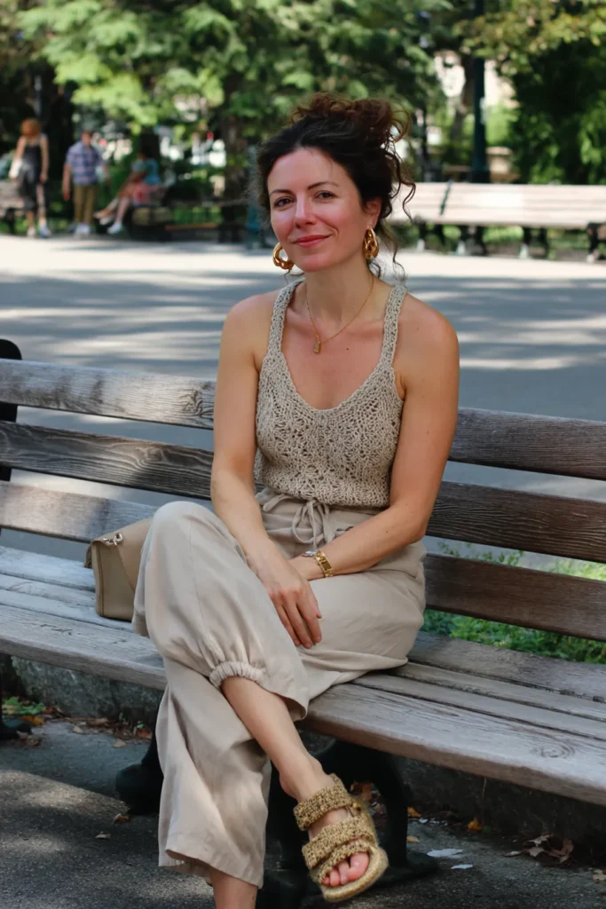 This outfit feels like sunshine and slow mornings. The knitted beige tank top adds just the right amount of texture, paired perfectly with loose, drawstring linen pants that give an easygoing yet put-together feel. Woven sandals and chunky gold jewelry bring in that earthy boho charm, while the neutral palette keeps it calm and timeless.
