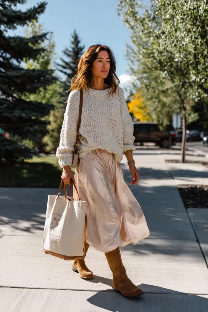This outfit is all about cozy textures and soft movement. The chunky off-white sweater feels perfectly oversized and relaxed, paired with a silky blush midi skirt that catches the light with every step. Tan suede boots add that earthy boho finish, and the oversized tote gives it an easy, lived-in feel. Everything about it whispers comfort with just the right amount of polish.
