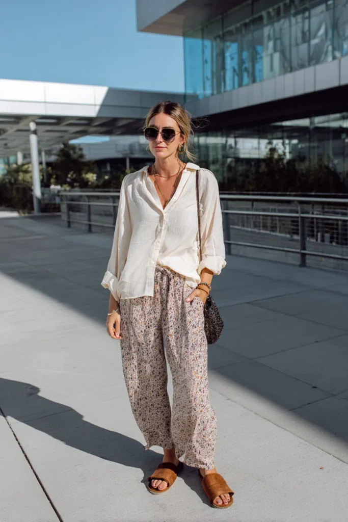 This look is the perfect example of casual boho done right. The loose cream button-up blouse pairs effortlessly with flowy floral trousers that move beautifully with every step. Brown slide sandals keep the outfit laid-back, while gold jewelry and oversized sunglasses add just the right hint of polish. It’s easy, breathable, and made for those warm, breezy days.