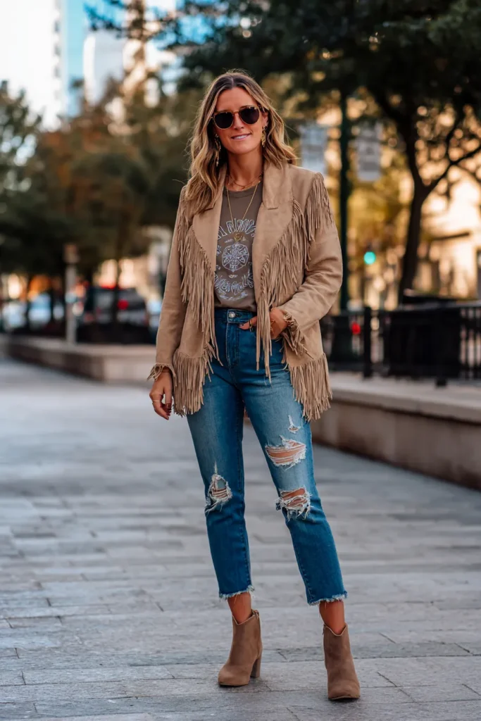 This look nails that laid-back boho confidence. A tan suede fringe jacket steals the show, layered over a vintage-style graphic tee for that perfectly worn-in vibe. The distressed blue jeans and tan ankle boots balance rugged and feminine energy, while simple gold jewelry and oversized sunglasses add a hint of polish. It’s effortlessly cool without even trying.