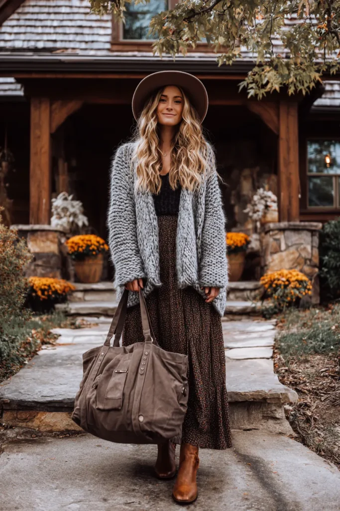 This outfit is all about cozy textures and boho balance. The oversized gray knit cardigan adds warmth and depth to the look, layered over a simple black top and a flowing maxi skirt with a delicate print. Brown ankle boots and a soft taupe hat tie everything together, while the oversized canvas tote adds a laid-back, lived-in touch that feels perfectly effortless.