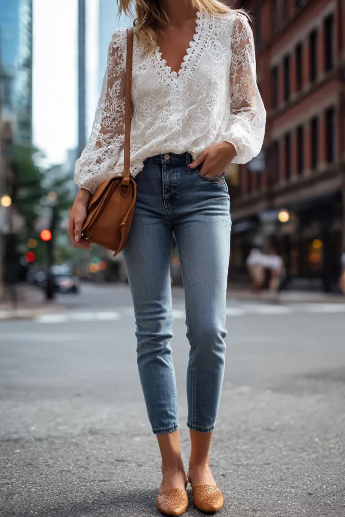This look takes everyday style and gives it a soft boho touch. The white lace blouse with delicate floral detailing adds instant elegance to a pair of classic high-waisted blue jeans. The tan crossbody bag and woven flats pull the outfit together with warm earthy tones, creating that perfect blend of feminine and relaxed.