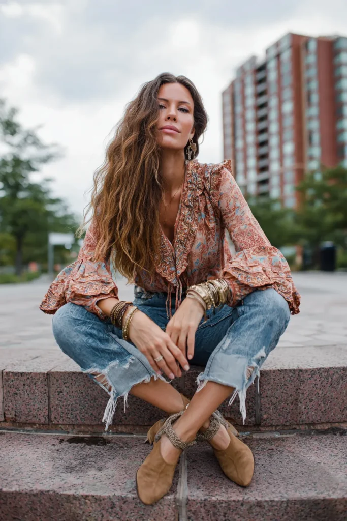 This outfit is the ultimate mix of laid-back and artsy. The flowy printed blouse in soft earthy tones features romantic ruffled sleeves and a loose neckline, paired effortlessly with cropped, distressed jeans. The suede ankle flats with braided detailing and a stack of gold bangles add just the right touch of boho personality. Every piece feels lived-in but still perfectly styled.