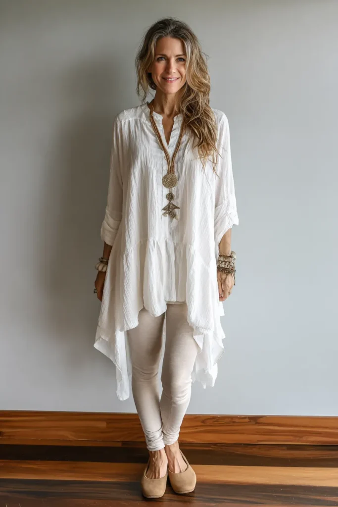 This outfit is pure boho serenity. The long, flowy white tunic with its airy fabric and asymmetrical hemline gives that graceful, free-spirited energy. Paired with light cream leggings and neutral suede flats, it feels light and effortlessly chic. The layered statement necklace and stacked bracelets add just the right amount of earthy personality without overpowering the look.