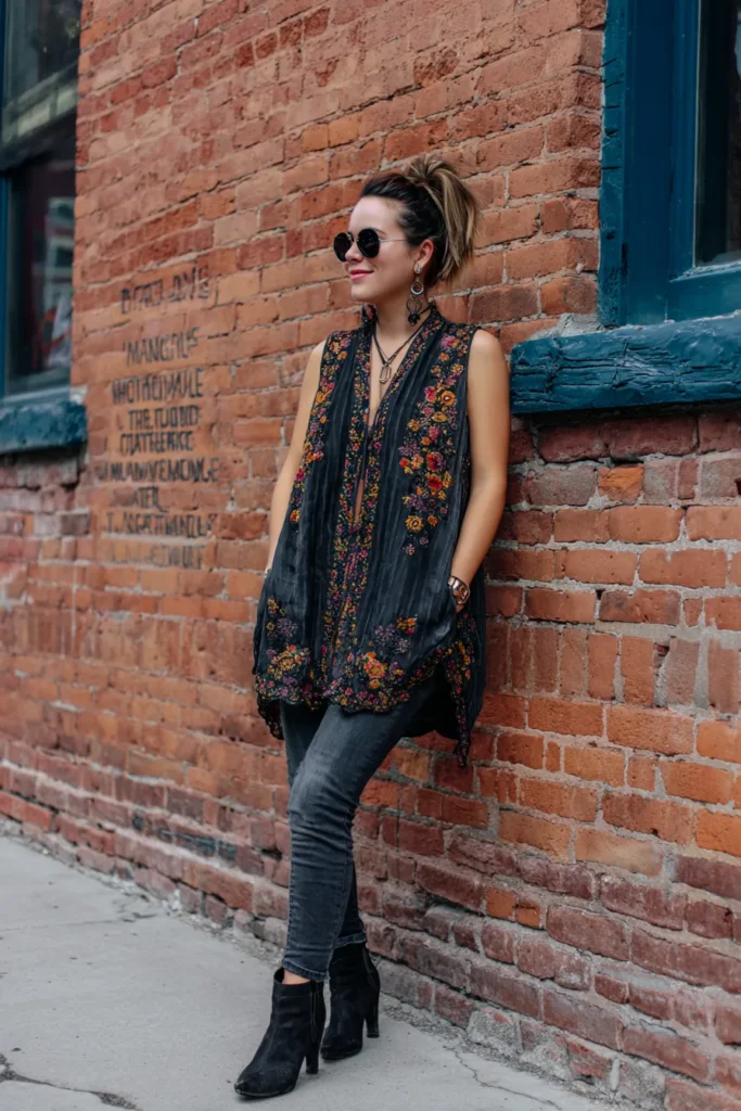 This outfit brings together the best of boho and rock-chic vibes. The sleeveless black tunic covered in colorful floral embroidery flows beautifully against fitted black jeans, creating the perfect mix of structure and ease. Black suede ankle boots add a bit of edge, while layered necklaces, statement earrings, and round sunglasses complete the effortlessly cool look.