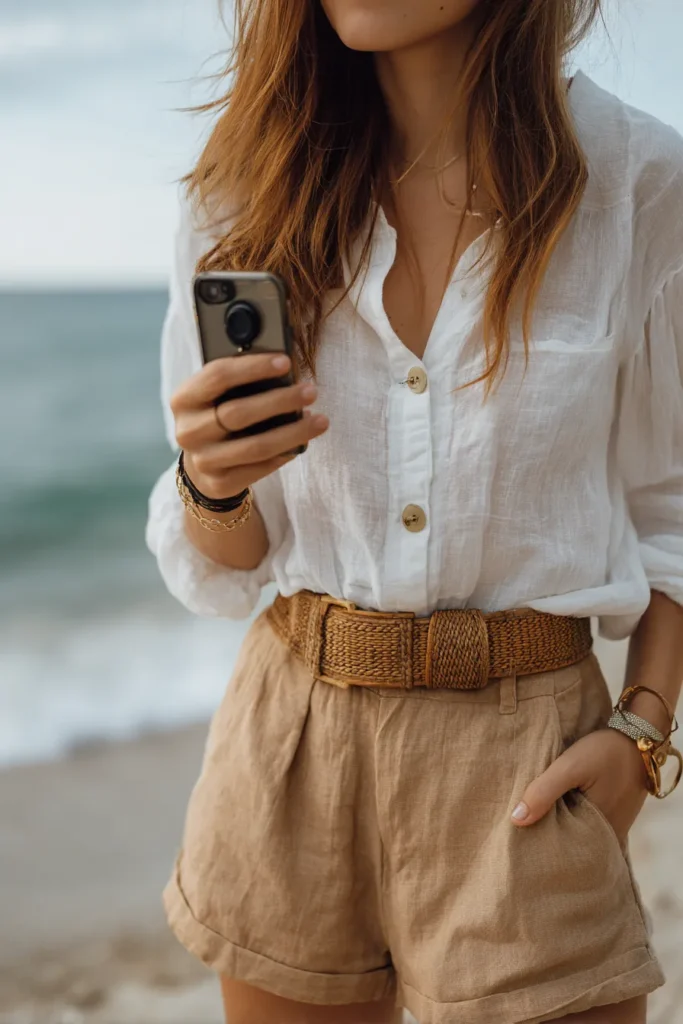 This outfit is a summer boho dream. A crisp white linen button-up meets high-waisted tan shorts cinched with a woven belt, creating a look that’s effortlessly chic. The gold jewelry and layered bracelets add a soft shimmer without feeling overdone, and the natural fabrics keep it all breathable and relaxed. It’s easy, sun-kissed style at its best.